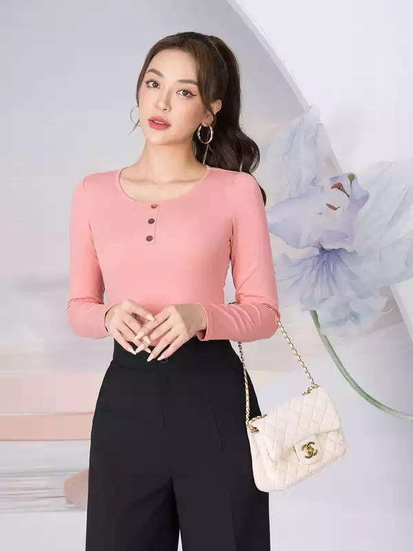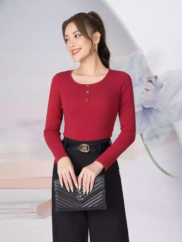 Áo thun nữ dáng ôm dài tay cổ đính 3 cúc